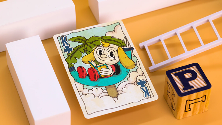 Each number card features atypical pip placements, which are adorned with 4 unique motifs representing the suits. Each motif reflecting the whimsical and colorful world which classic animations present the audience with.
