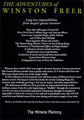 The Adventures of Winston Freer collects 200 pages of material with 50 effects, combining Freer's booklets and articles, an incredible collection of his letters, memorabilia, news items, sketches, and notes to provide an unprecedented look at this brilliant creator. You'll even see a brief video of Freer performing his suspension in 1941! This CD will reveal the man behind some of the most daring and creative magic of our time.