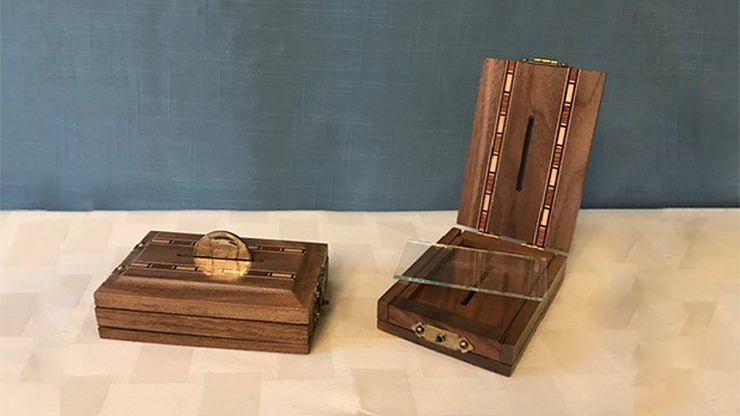 The Karpinski's Coin Penetration is a decorative box that holds a piece of glass. A coin is placed into a hole on top of the box and, upon your command, passes through the piece of glass and falls through the bottom.