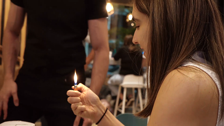 To finish, he wraps the ribbon around the white lighter, snaps his fingers, and reveals it's orange again. Finally, he gives the lighter for examination!