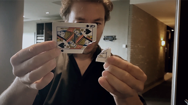 Next, the card is lost in the pack and the deck is sprung against a window or glass pane...as all the cards drop on the floor, one card -with a corner missing- is seemingly stuck on the window.