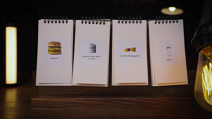 Four audience members each randomly flip through a section. Each participant selects a different food item. The magician's lunch in the box perfectly matches the items randomly chosen by the audience. It's not just the ability to predict playing cards or food, it's the complete freedom to predict anything imaginable.