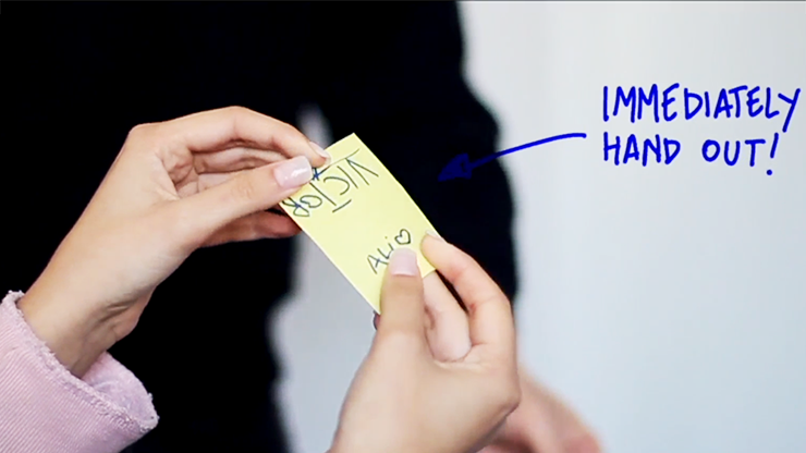 Imagine this, you sign a Post-it, ask to the spectator to peel it off from the pad and exam it, then you stick this Post-it outjog into the next one and the spectator signs this second Post-it... When you peel the spectator's Post-it and you have yours sticked on his, looks like is one single large post-it but in reality are two, the spectators can see that this is true. Now, without palming anything, with no sneaky moves or weird actions and with both signatures in full view the hole time, you just rub the gap between both post-its and smoothly there are fuse together in one large single piece, with both signatures on it!