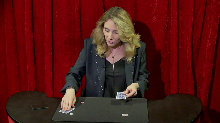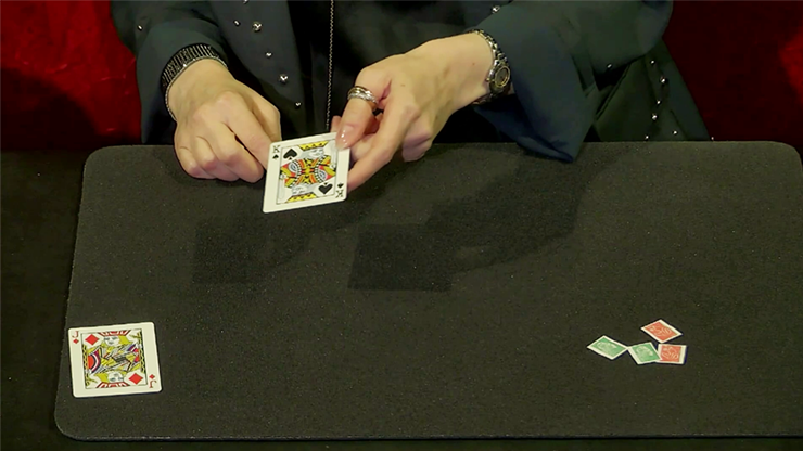 The magician places four stamps on the close-up mat.