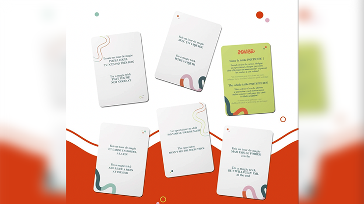 "Do a trick with your eyes closed", "The whole table must take part in the magic trick", "Something's getting hot", ... Through all these challenges, progress in the art of improvisation. A game in which each magician in turn can draw a card and take part in the game! What's more, the cards are in both French and English, so there's no excuse not to bring this game along to your magic conventions!