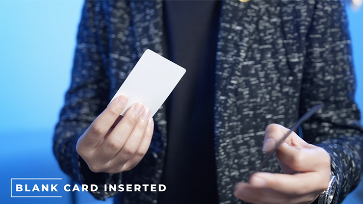 The magician displays an envelope and a blank card, places the blank card inside the envelope, and has a spectator sign in the window of the envelope.