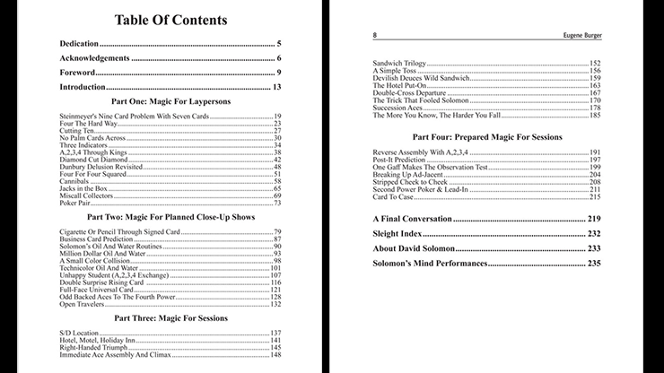 This is David Solomon's first book. It features more than forty of his original card routines and dozens of the techniques used within those routines. It is full of novel handlings and ideas that you will be able to apply to other card effects in your repertoire.
