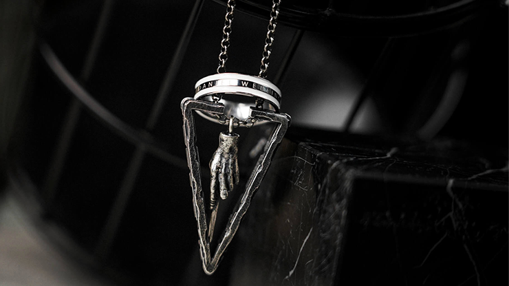The original design of The Frame was rectangular, surrounding a pendant shaped like a mechanical robot. However, Terry was later inspired by the Deathly Hallows from Harry Potter and modified the frame into a triangle to resemble the Cloak of Invisibility. The pendant features a magic wand, a quintessential wizard's item, and the audience member's ring represents the final missing artifact of the Deathly Hallows - the Resurrection Stone.