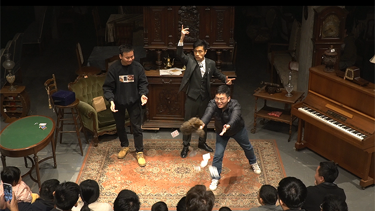 The magician invites two spectators onstage: one selects and signs a card, while the other looks after the raccoon assistant, Papi. When the signed card is tossed into the air, Papi leaps heroically... only to spectacularly fall on his back. The magician sighs, "He's too greedy-he ate the card."