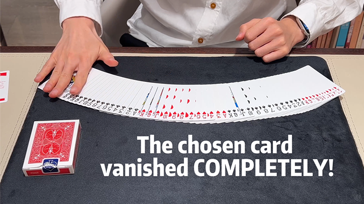 Start with a sealed deck, the cards are in new deck order. After a card is chosen, the chosen card vanish in the deck completely. Immediately the chosen card reappears inside the card case. The effect is just as described.