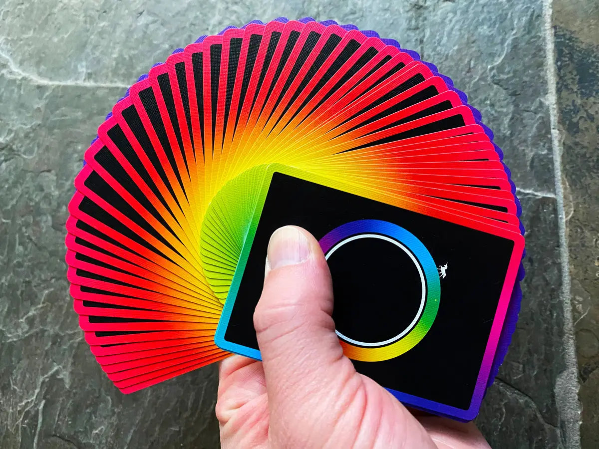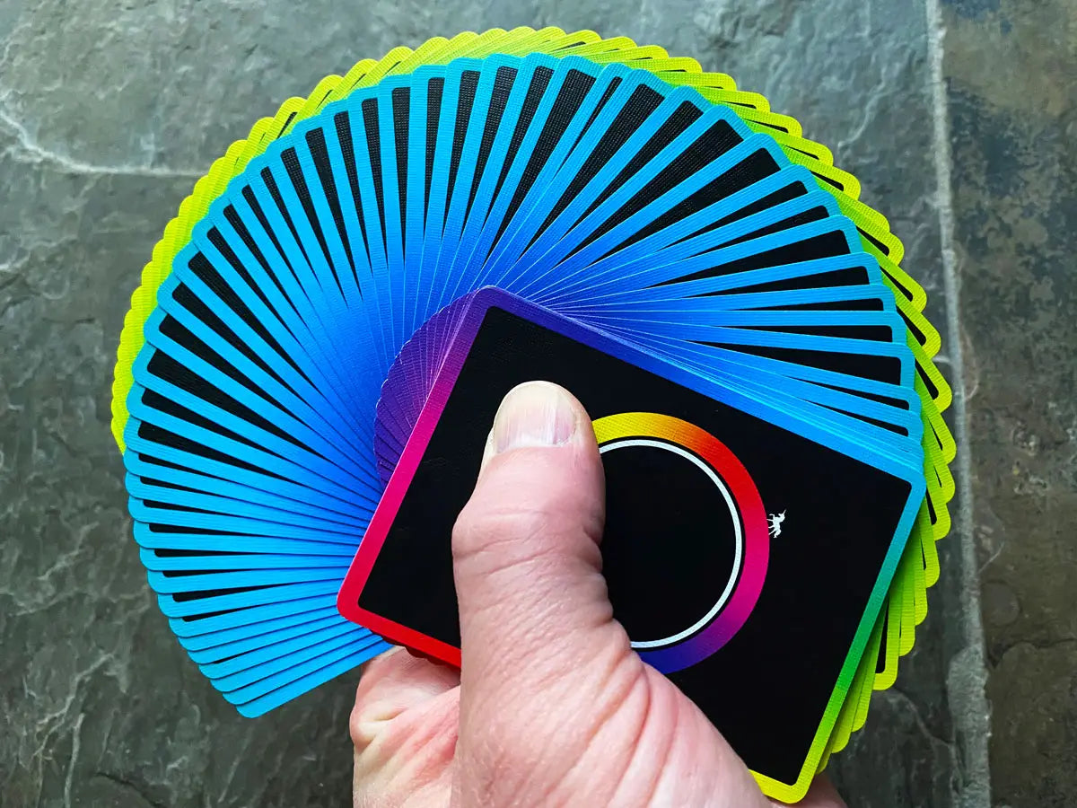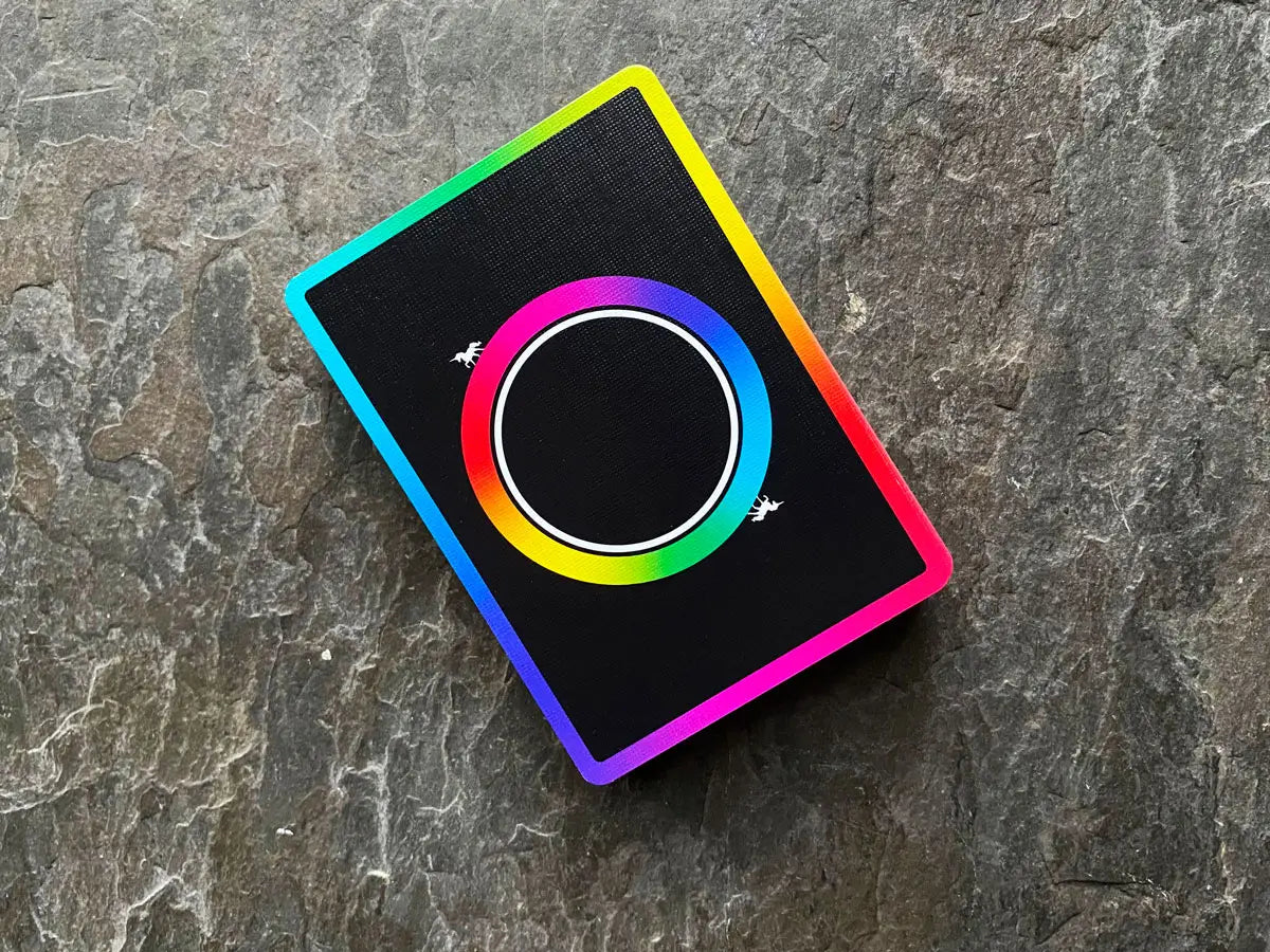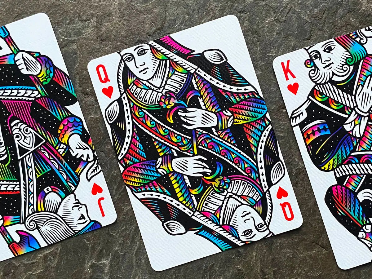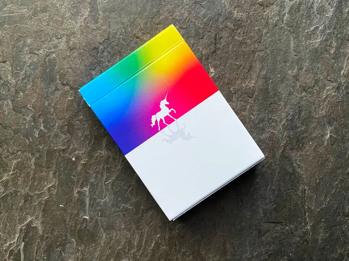 Unicorn Playing Cards feature a bright rainbow color palette and, of course, unicorns! Designed for cardistry, the back border features a 360 degree rainbow stripe which produces 4 different fan colors. The court cards showcase a unique larger-than-life full-bleed style and the pip layouts are also original and unique to this deck. This deck was printed by USPC on Bicycle stock with embossed finish. The tuckbox is unsealed allowing for easy access and no sticker residue.